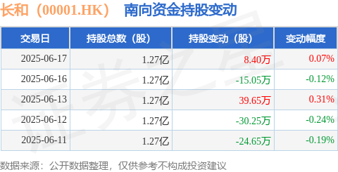 本站消息,6月17日南向资金增持8.4万股长和(00001.HK)。近5个交易日中,获南向资金减持的有3天,累计净减持21.9万股。近20个交易日中,获南向资金减持的有12天,累计净减持227.45万股。截至目前,南向资金持有长和(00001.HK)1.27亿股,占公司已发行普通股的3.32%。